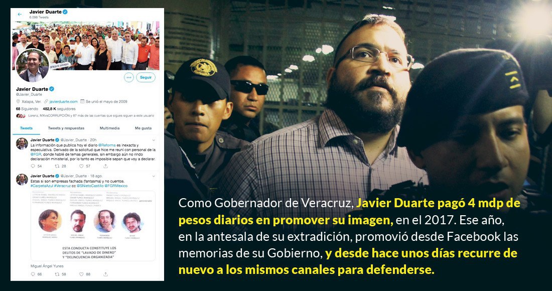 De acuerdo con Reforma, Javier Duarte derrochó en publicidad 8 mil 727 millones de pesos, equivalentes a 4 millones de pesos por día durante su Gobierno. El ex Gobernador también mostró preocupación por lo que los veracruzanos expresaban en las redes sociales. Una de estas preocupaciones se vio materializada en la llamada “Ley Duarte”, o “Ley Antituitera”, una modificación al artículo 373 del Código Penal de Veracruz que condenaba cualquier falsa afirmación sobre la existencia de explosivos u otros artefactos que pudieran dañar a la población.