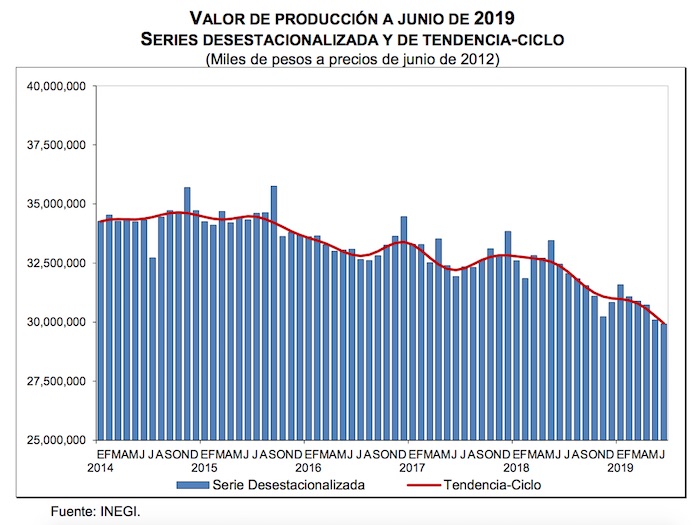 Este rubro también hila su quinta caída consecutiva, al igual que el valor total de la construcción. En su comparación anual, es decir, si se compara con su nivel de junio de 2018, la caída en el valor de la construcción fue de 7.8 por ciento, y liga doce meses consecutivos a la baja.