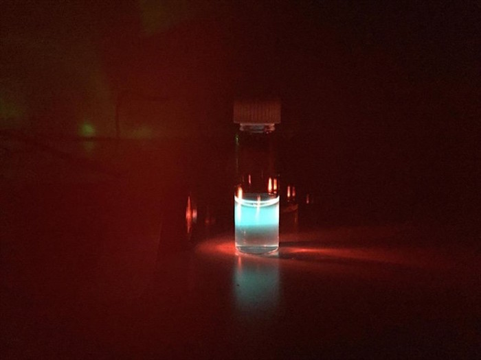 Estas nanopartículas, que contienen los elementos erbio e iterbio, pueden convertir fotones de baja energía de la luz NIR en luz verde de mayor energía que los ojos de los mamíferos pueden ver.