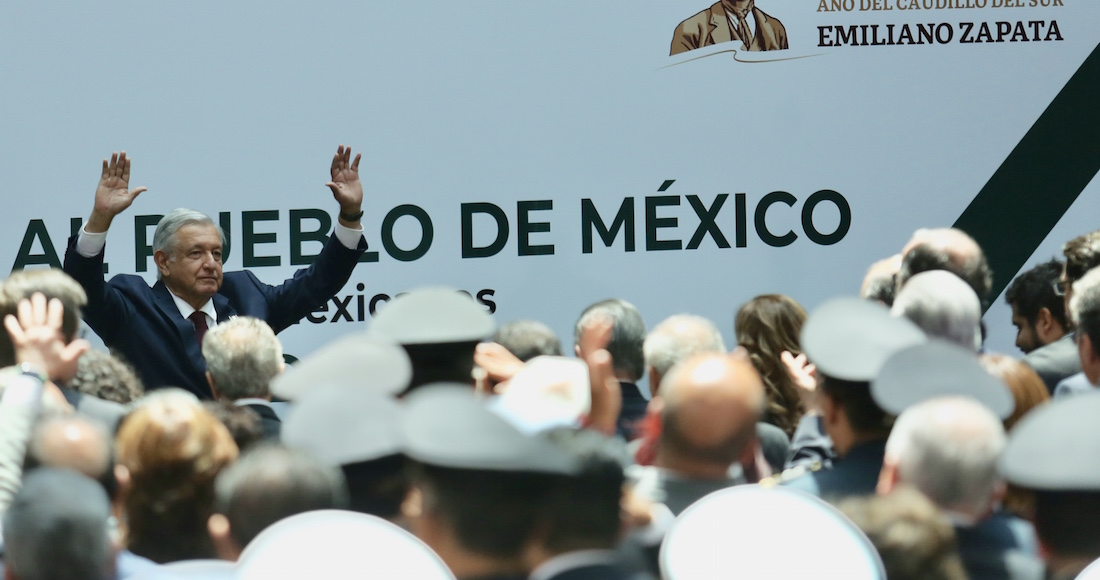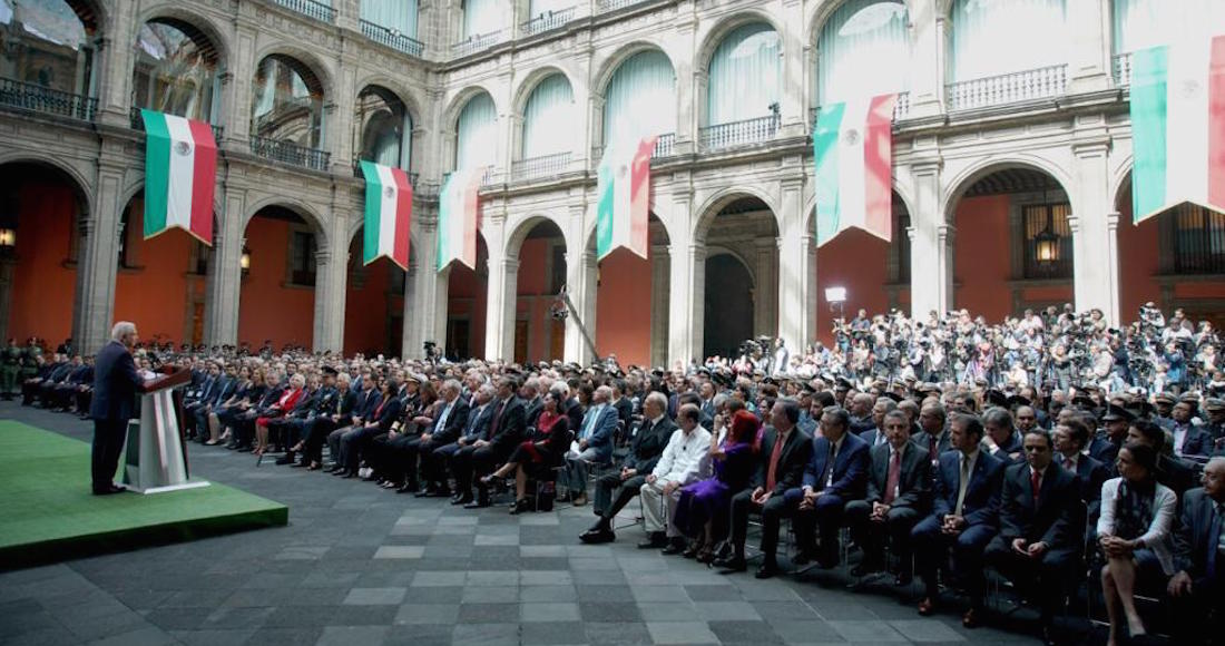López Obrador revivió esta tradición a su manera: Subió al podio y aguardó poder hablar. Al exterior de Palacio el cántico a la voz de “Presidente, Presidente” hizo presencia como lo hizo durante su investidura presidencial en diciembre pasado, y como lo hiciera en noviembre de 2006, afuera de Palacio frente a cientos de personas que al igual que él, desconocieron la derrota en los comicios presidenciales de ese año y abolieron “el régimen de corrupción y privilegios” que puso el pie al primer Gobierno de izquierda.