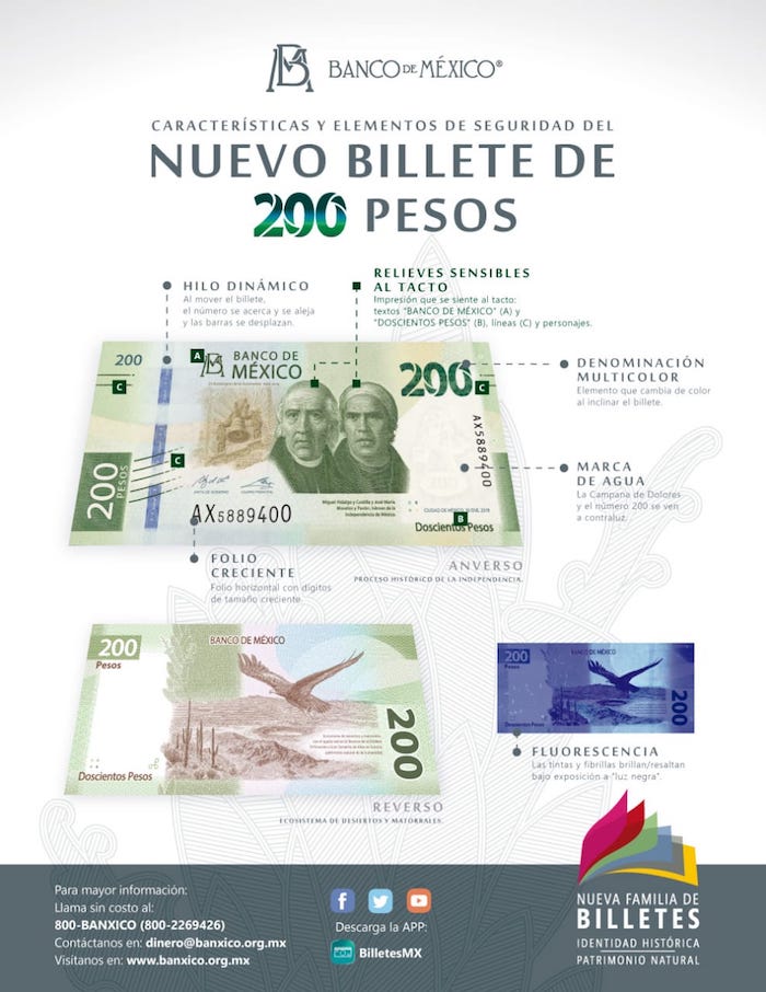 El 10 de junio el director general de Emisión del Banco de México (Banxico), Alejandro Alegre Rabiela, informó la puesta en circulación del nuevo billete de 200 pesos tiene como objetivo disminuir la falsificación con mejores medidas de seguridad.