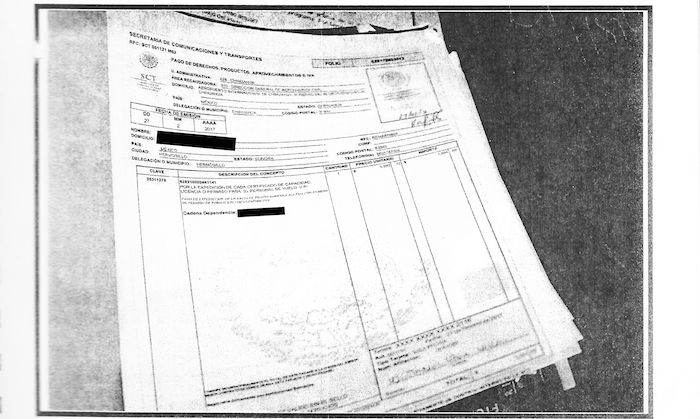 En el auto encontraron otro recibo. Este es un permiso otorgado por la Secretaría de Comunicaciones y Transporte (SCT) el 27 de febrero de 2017 a un piloto aviador por “la expedición de cada certificado de capacidad, licencia o permiso para personal de vuelo”. Pero ni este documento, ni su propietario fueron investigados. Este Colectivo pudo averiguar que se trata de un piloto que en 2011 tuvo un accidente en Sinaloa en una avioneta Cessna.