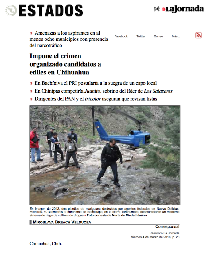 Impone el crimen organizado candidatos a ediles en Chihuahua. La Jornada, 04/03/2016: https://www.jornada.com.mx/2016/03/04/estados/028n1est