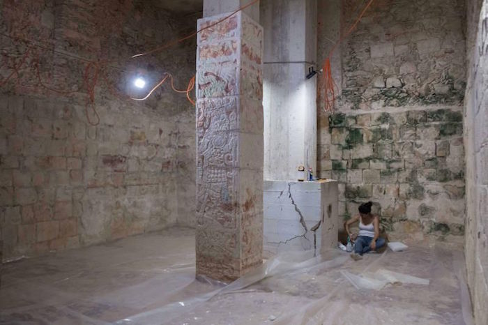 "En la subestructura del Templo de los Guerreros nos enfocamos a la intervención integral de los elementos pictóricos en los pilastrones que, a diferencia de lo que hay afuera de la zona arqueológica, aún conservan su policromía, el arte de pintar o decorar con varios colores", explica la restauradora Claudia García Solís.