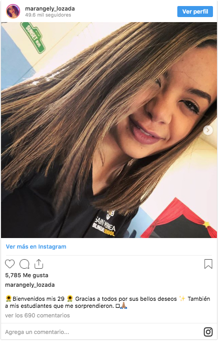 A través de redes sociales, Marangely, agradeció a todos por recordar su día y publicó una serie de fotografías festejando: "Bienvenidos mis 29 ? Gracias a todos por sus bellos deseos ✨ También a mis estudiantes que me sorprendieron", escribió la hija de Vico C.