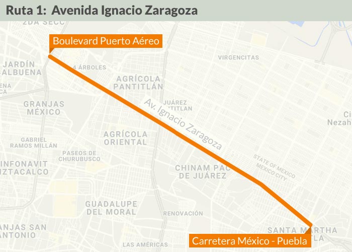 1. Avenida Ignacio Zaragoza, desde el Metro Boulevard Puerto Aéreo y hasta la carretera México Puebla: Se trata de un recorrido de unos 13 kilómetros, desde el metro Boulevard Puerto Aéreo y hasta los límites del Estado de México, donde inicia la carretera México-Puebla. Atraviesa al menos tres alcaldías Venustiano Carranza, Iztacalco e Iztapalapa y por ella circulan diversas rutas de microbús y combis.