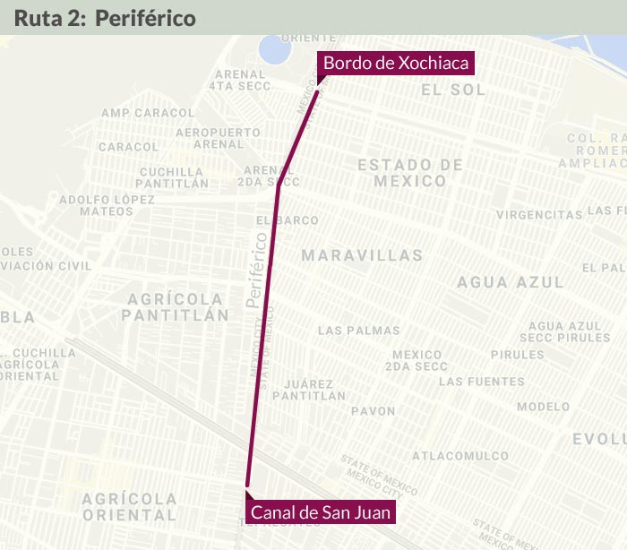 2. Periférico desde Canal de San Juan y hasta el Bordo de Xochiaca: Esta ruta también atraviesa las alcaldías de Iztacalco y Venustiano Carranza y llega hasta el Estado de México.