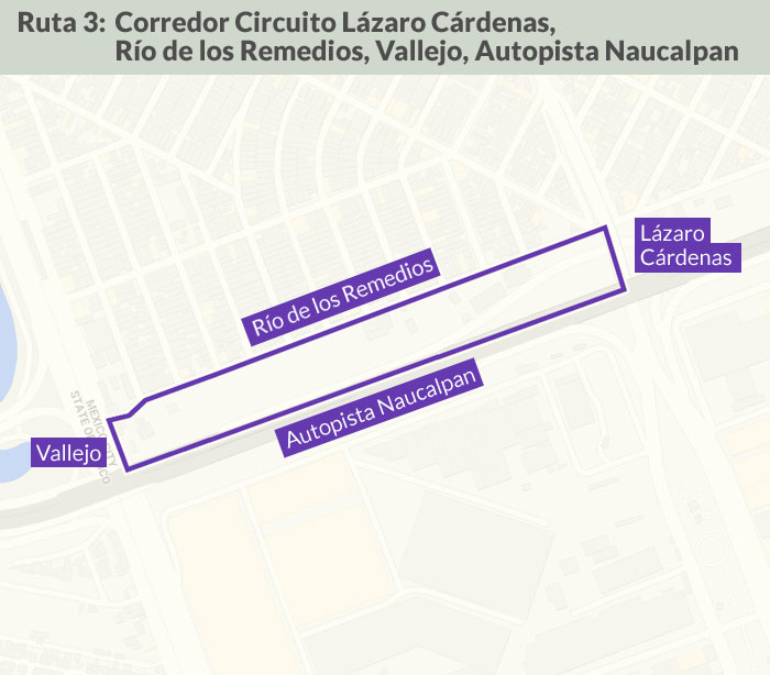3. Corredor Circuito Lázaro Cárdenas, Río de los Remedios, Vallejo, Autopista Naucalpan: En los límites de la Alcaldía de Gustavo A. Madero y el municipio de Tlalnepantla de Baz corren estas rutas.
