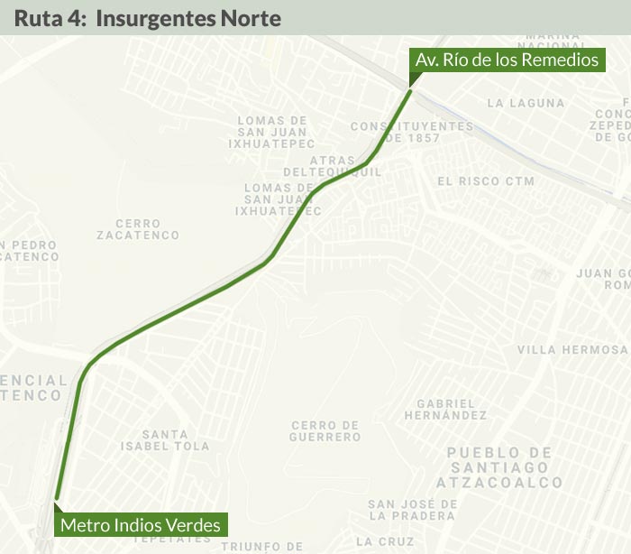 4. Avenida Insurgentes Norte, desde el Metro Indios Verdes hasta la avenida Río de los Remedios: Esta ruta atraviesa la Alcaldía de Gustavo A. Madero, y es un tramo de unos 14 kilómetros.