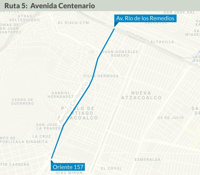 5. Centenario desde Oriente 157 a Avenida Río de los Remedios: Una ruta de más de dos kilómetros que atraviesa la Alcaldía Gustavo A. Madero.