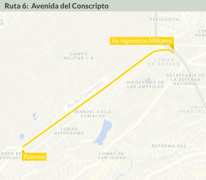 6. Avenida del Conscripto e Ingenieros Militares, de Cuatro Caminos a Palermo esquina avenida Conscripto: Esta ruta conecta la zona limítrofe de la Alcaldía Miguel Hidalgo y el municipio de Naucalpan, en el Estado de México.