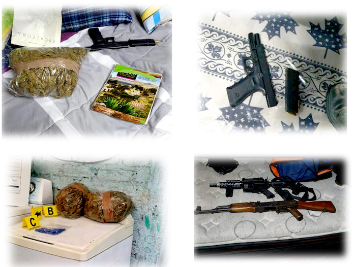 Se decomisaron en el lugar también cuatro bolsas al parecer con mariguana; y una más con 54 envoltorios de papel con una sustancia azul, al parecer cocaína. También se aseguraron cuatro pistolas, y tres armas largas de diferentes calibres, entre la que destaca una subametralladora.