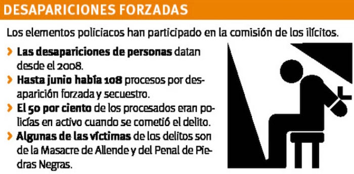 La Fiscalía especializada de Coahuila admitió que la mitad de personas llevadas a juicio en Coahuila eran elementos policiacos. Los oficiales pertenecían a diferentes corporaciones de seguridad, estatales, federales y municipales. Para que el delito de desaparición forzada se configure en caso de ser cometido por un policía, el elemento investigado debe estar en activo.