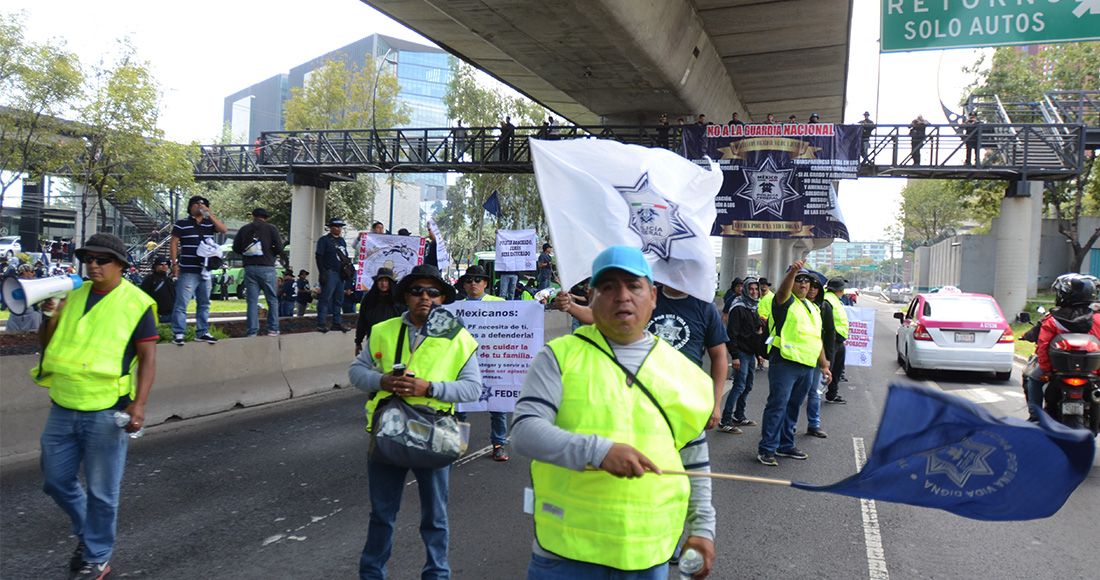 Elementos de la Policía Federal se manifestaron esta tarde, bloqueando en ambos sentidos Periférico Sur, frente a la Torre Pedregal, ocasionando caos vial.
