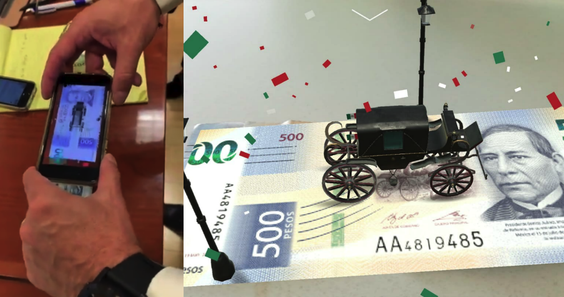 "Los nuevos billetes de 500 y 200 que puso en circulación el Banco de México tienen un componente de realidad aumentada. Pon el teléfono encima del de 500 y ve pasar entre vítores la carroza de Benito Juarez; si lo hacen encima del de 200 escucharán la campana de Dolores", explica Herrera en la grabación.