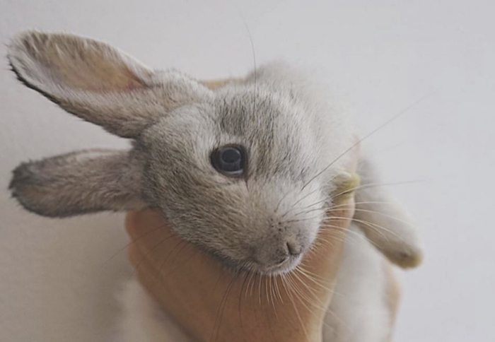 Mia publicó una foto de uno de los conejos rescatados, que fue sometido a un tratamiento veterinario para recuperar la posición erguida de su cabeza, y que debido a las sucias condiciones de vida de la granja donde permanecía, fue víctima de un parásito en su oído.