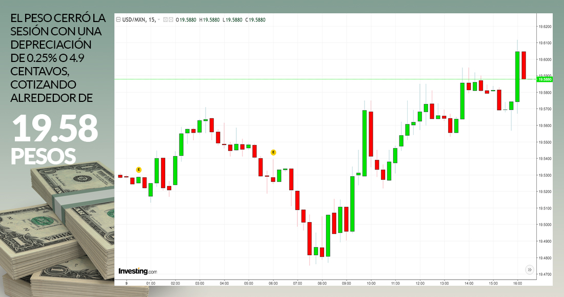 El dólar spot se vendió en 19.58 pesos, en tanto que en ventanillas se colocó en los 19.86 pesos por cada billete verde. A lo largo de la sesión el tipo de cambio alcanzó un mínimo de 19.4746 y un máximo de 19.5942 pesos por dólar.