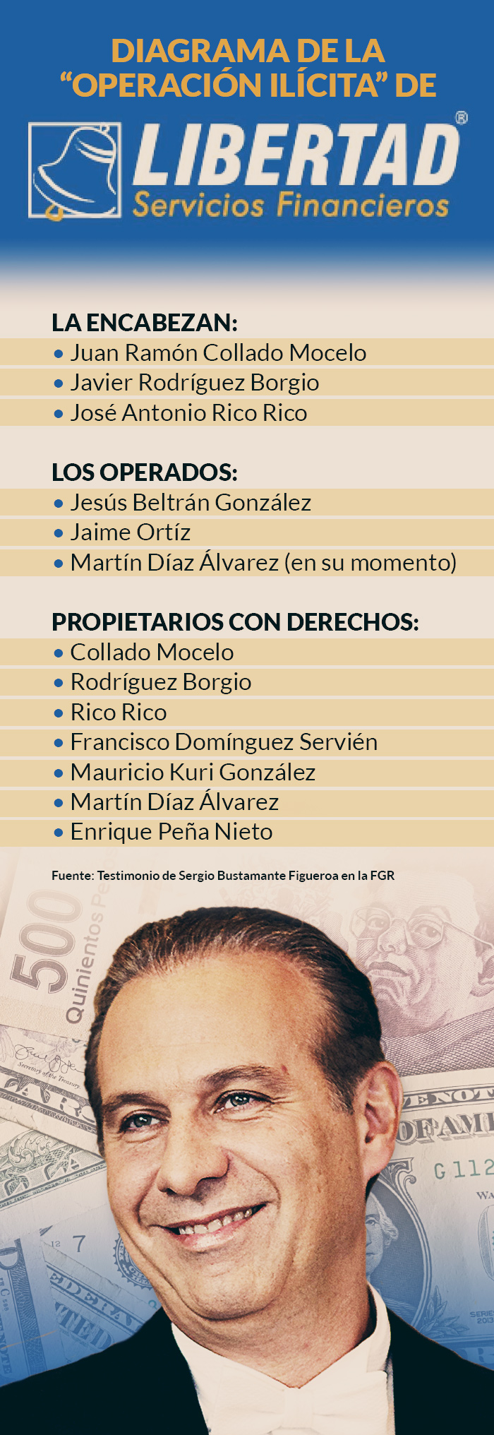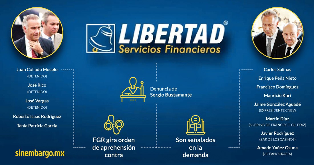 En la orden de aprehensión con causa penal 269/19, el empresario Sergio Bustamante acusó que "atrás de Rico Rico y Collado [ya detenidos] estaba gente muy pesada que en realidad eran los verdaderos propietarios de Libertad Servicios Financieros": el ex Presidente Enrique Peña Nieto, el ex Presidente Carlos Salinas de Gortari, el Gobernador de Querétaro Francisco Domínguez Servién y el Senador Mauricio Kuri González.