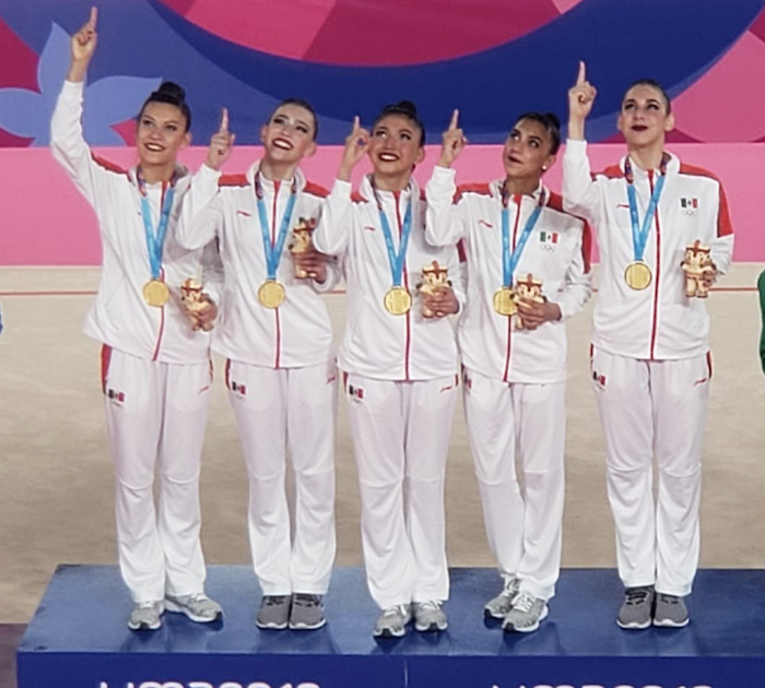 Karen Villanueva, Ana Galindo, Mildred Maldonado, Adriana Hernández y Britany Sainz integrantes de gimnasia rítmica que le dieron a México un resultado histórico al coronarse en los Panamericanos de Lima 2019. Las jóvenes consiguieron dos títulos panamericanos y una medalla de plata.