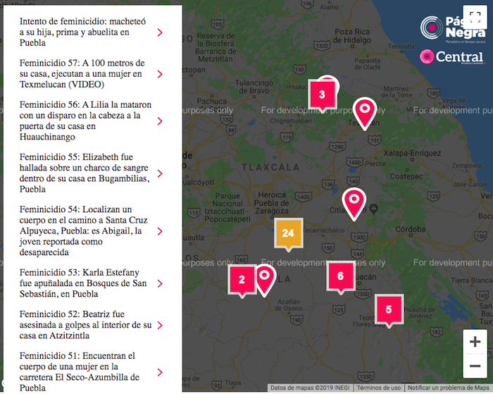 Este es el mapa de CENTRAL y PÁGINA NEGRA que contabiliza los feminicidios ocurridos en el estado de Puebla en este 2019: