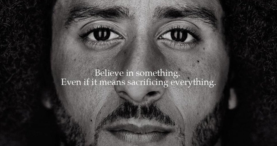 Kaepernick se convirtió en un símbolo para los Estados Unidos cuando, durante un juego de la NFL en 2017, decidió arrodillarse al momento de entonar su himno nacional, como protesta a la ola de violencia que en ese momento se estaba dando por parte de elementos policiales a personas de la comunidad afroamericana. Posteriormente, el ex mariscal de campo fue contactado por la empresa y se convirtió en la cara principal de su campaña.