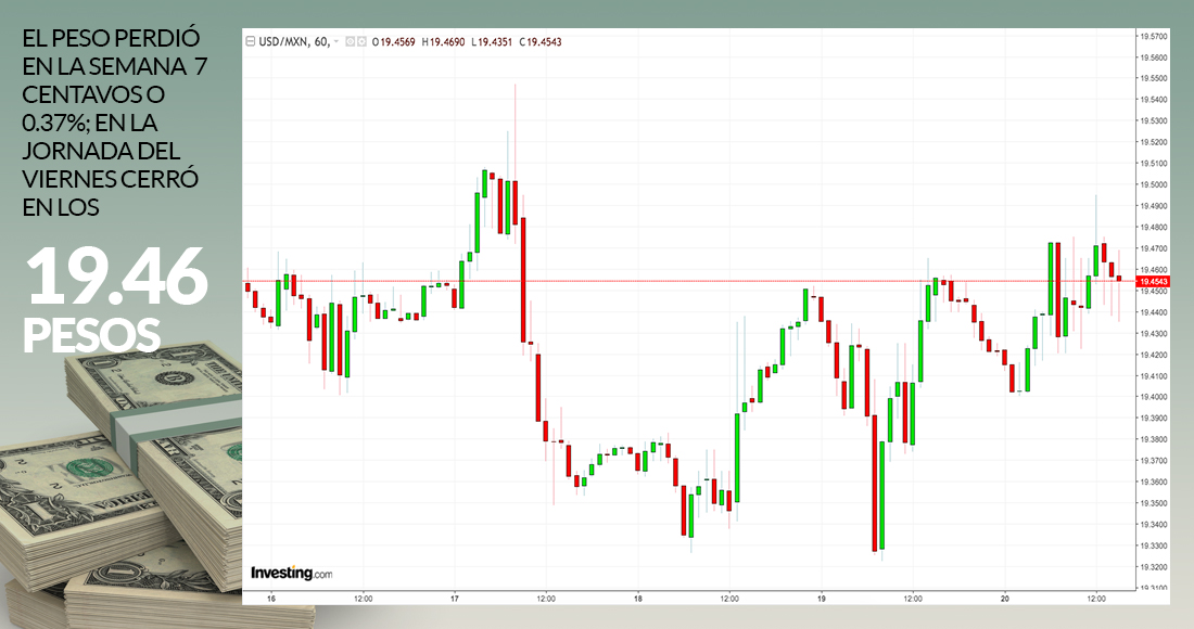 El dólar spot cerró en 19.46 pesos, en tanto que en ventanillas se colocó en los 19.75 pesos por cada billete verde. El retroceso semanal fue de 7 centavos o 0.37 por ciento.