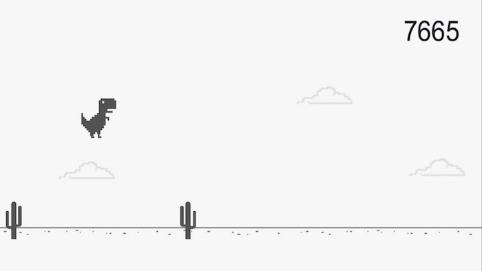 Este juego aparece en el navegador cuando el usuario se queda sin conexión y se activa cuando el jugador pulsa la barra espaciadora. Se trata de un minijuego lineal que consiste en que el dinosaurio va corriendo sin parar hacia delante y el usuario tendrá que utilizar los distintos controles del teclado para esquivar los obstáculos que se le presentan en el camino como cactus o pájaros.
