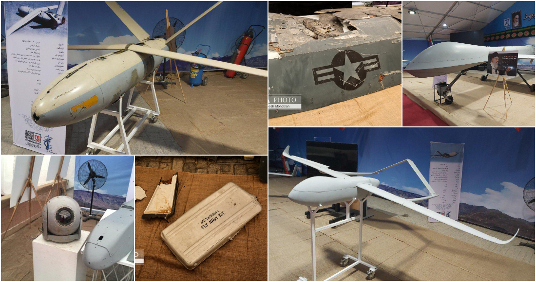 Entre los drones mostrados al público figura el estadounidense RQ-170 Sentinel, interceptado por Irán en 2015 cuando sobrevolaba la ciudad de Kashmar cerca de la frontera con Afganistán, y un RQ-4 Global Hawk —también de EU— que la Guardia Revolucionaria derribó en el estrecho de Ormuz en junio de este año; así como el británico Phoenix.