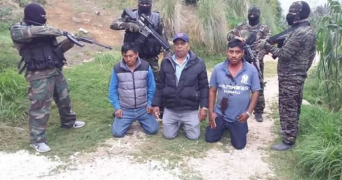 El segundo Regidor del concejo municipal Mariano Sántiz Méndez y los dos "mayoles" o policías, fueron exhibidos en una fotografía donde aparecen hincados y cuatro hombres armados apuntándoles a la cabeza.