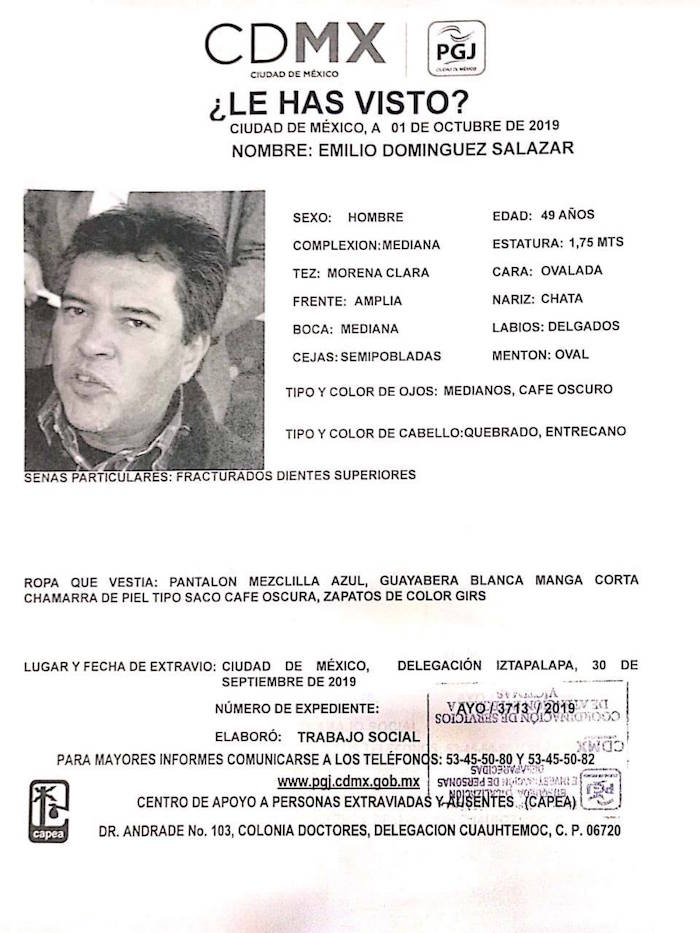 La Procuraduría General de Justicia (PGJ) de la Ciudad de México había informado a través de la Fiscalía Especializada en la Búsqueda, Localización e Investigación de Personas Desaparecidas (Fipede), sobre la desaparición de Emilio Domínguez Salazar, de 49 años de edad.