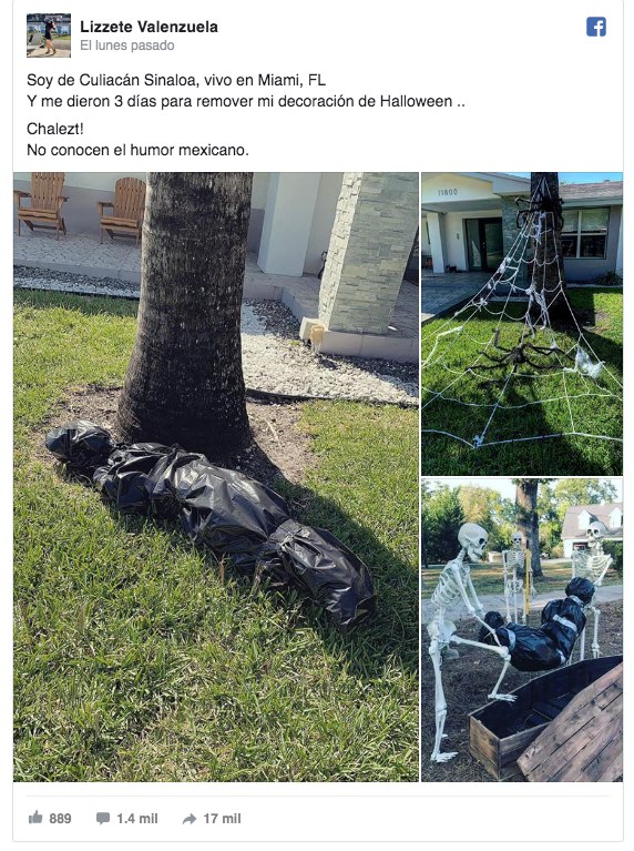 En una publicación de Facebook, Lizzete escribió: “Soy de Culiacán Sinaloa, vivo en Miami, FL, y me dieron 3 días para remover mi decoración de Halloween. No conocen el humor mexicano”.