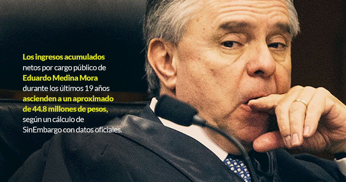 Los ingresos acumulados netos por cargo público de Eduardo Medina Mora Icaza durante los últimos 19 años, ascienden a un aproximado de 44 millones 767 mil 320.22 pesos, de acuerdo con un cálculo de la Unidad de Datos de SinEmbargo, con base en los tabuladores del Gobierno federal.