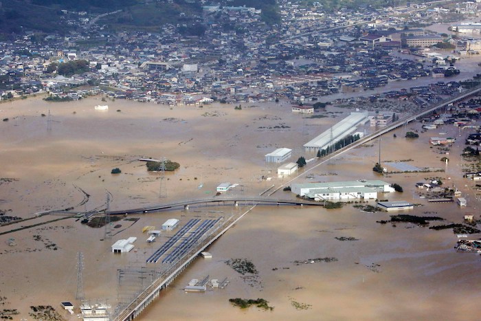 La cadena pública NHK difundió desde primera hora de este domingo imágenes de áreas residenciales inundadas por desbordamientos fluviales y de las labores de rescate.