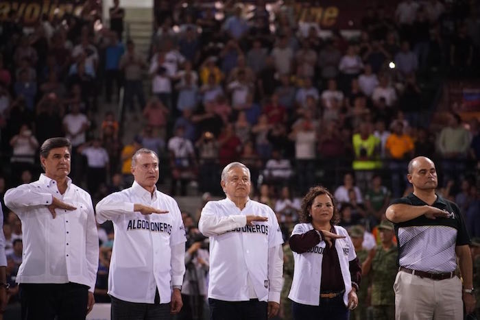 Durante la presentación de inauguración Andrés Manuel salió acompañado del Presidente de la Liga Mexicana del Pacífico, Omar Canizales y el Gobernador de Sinaloa, Quirino Ordaz.