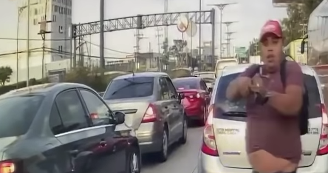 Una cámara captó el momento exacto en que el criminal atraviesa un embotellamiento en la carretera para encañonar al chofer de un vehículo.
