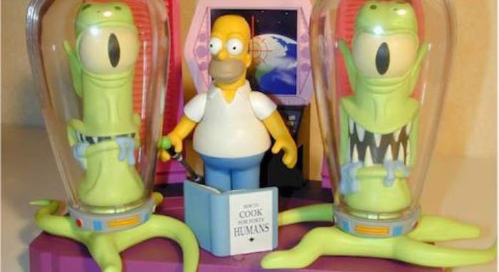 "TreeHouse of Horror 2" del año 2001, basado en el séptimo especial de Halloween, y conformado por una nave espacial extraterrestre, y tres figuras coleccionables: Kang, Kodos y Homero; en Amazon, el producto se ofrece por 100 dólares, aproximadamente 1,927 pesos.