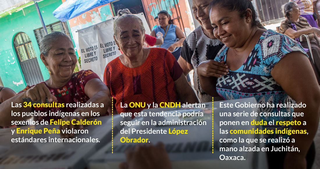 A finales de agosto, el Comité de Naciones Unidas para la Eliminación de la Discriminación Racial (CERD) le expresó al presidente que los procesos de consulta a los pueblos indígenas en México “no son realizados de manera previa, no toman en cuenta los usos, costumbres, cultura y debida representación de los pueblos afectados, no se proporciona información clara, precisa y culturalmente adecuada, y, además, con frecuencia, son llevados a cabo en contextos de amenazas, criminalización y hostigamiento, perjudicando su carácter libre”.