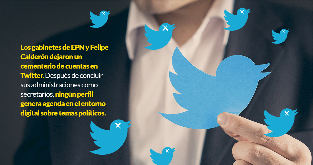 Al corte de esta nota se encuentran en Twitter 31 cuentas pertenecientes a ex titulares de dependencias del Gobierno de Felipe Calderón, de las cuales, solo 12 continúan activas, 1 está protegida, 1 fue suspendida y 2 fueron abiertas, pero nunca tuvieron actividad; el resto, correspondiente a 15 cuentas, han sido abandonadas por sus administradores, es el caso de la del fallecido Alonso Lujambio, ex Secretario de Educación, cuya cuenta verificada cuenta con más de 81 mil seguidores.