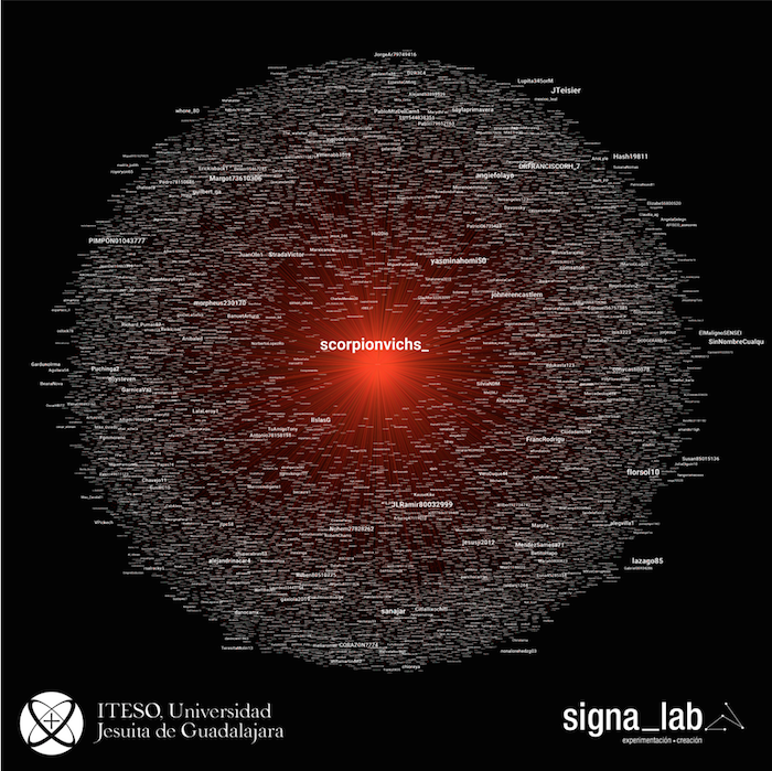 “Por ejemplo, en este caso, la cuenta @scorpionvichs_ tuvo, en casi cinco días, un grado de salida con pesos de 641. Esto quiere decir que utilizó 641 veces el hashtag, lo que significa un promedio de 128 menciones diarias, que rebasa con mucho las posibilidades de una cuenta promedio y, además, esta cuenta aparece hoy como inexistente, lo que podría estar indicando que fue creada específicamente para amplificar este hashtag”, se señala en el informe.