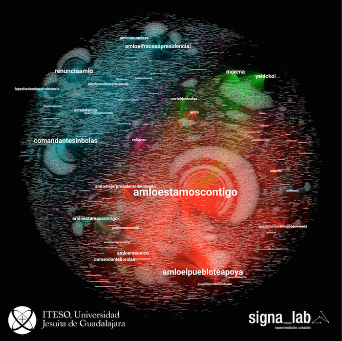 “Las tendencias analizadas acumularon 111,000 tuits, en los que participaron 22,709 nodos (o lugares-puntos de enunciación), que generaron 56,469 aristas, es decir, que interactuaron esa cantidad de veces, organizados o agrupados en 132 clusters, o comunidades,” señala el informe.