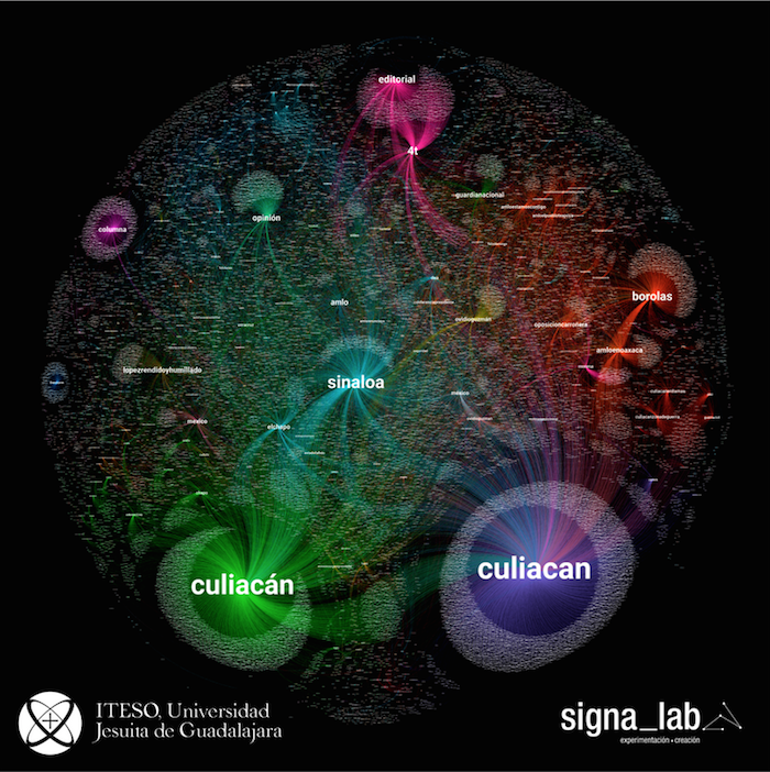 "En esta primera visualización se muestra un comportamiento orgánico en los primeros momentos de la crisis. Etiquetas como “culiacán/guardia nacional”, en color verde; morado “culiacan”, azul “sinaloa/el chapo” y amarillo “Ovidio Guzmán”, constituyen la respuesta inicial de las y los usuarios de Twitter, para pronunciarse, compartir contenido propio o de medios de comunicación o de otros usuarios. Una respuesta sorprendida y preocupada", muestra en su informe Signa_Lab.