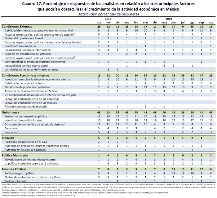 La encuesta fue recabada por el Banco de México entre 37 grupos de análisis y consultoría económica del sector privado nacional y extranjero. Las respuestas se recibieron entre los días 16 y 30 de octubre.