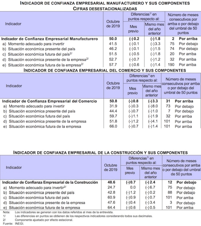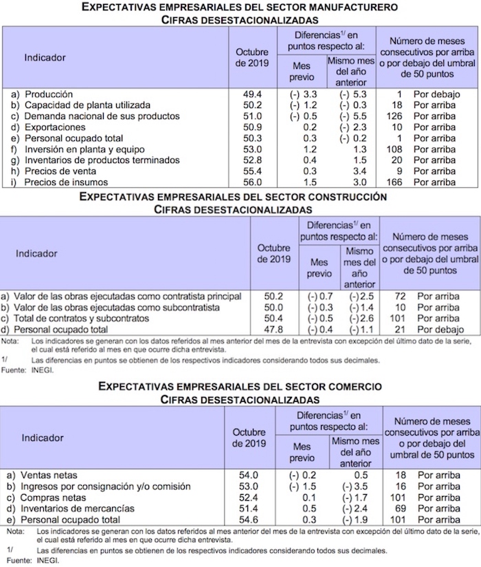 Las Expectativas Empresariales (EE) dadas a conocer por el Inegi para el mes de octubre mostraron descensos mensuales en todos los indicadores del sector de la construcción; en tres de los nueve del sector manufacturero; y en dos de los cinco del de comercio.
