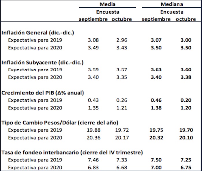 Los niveles de inflación subyacente para el cierre de 2019 bajaron del 3.59 al 3.57 por ciento y para 2020 bajaron del 3.40 al 3.35 por ciento.