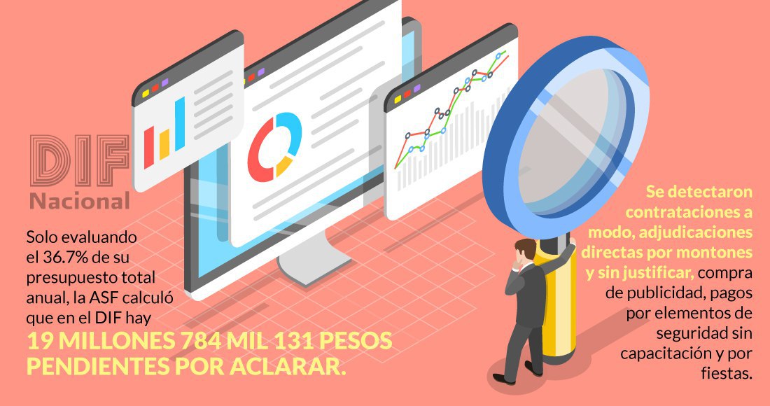 La ASF encontró que el DIF realizó contrataciones a modo; no pagó impuestos de los salarios de los trabajadores; realizaron contratos por adjudicación directa por montones y sin justificación; pagó por fiestas de las que no hay evidencia de que se realizaron; no cobró multas por retraso en los servicios a contratistas; pagó por publicidad sin un monitoreo, sin esquemas de alcance ni monitoreo y pagó por un servicio de limpieza “fantasma”.