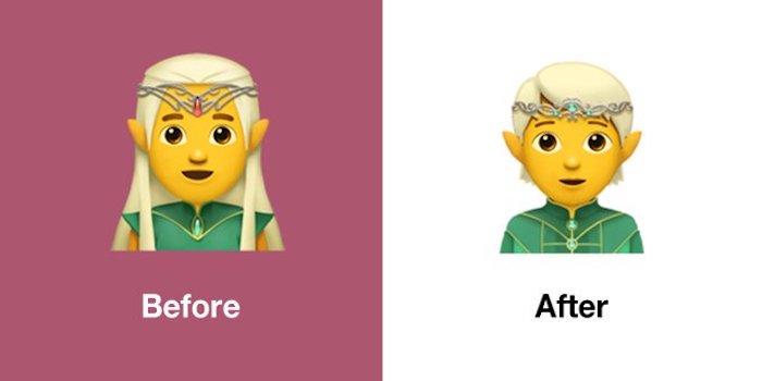 Ahora Apple introduce una serie de cambios respecto a los diseños de la versión anterior de iOS. La mayoría de ellos consisten en un rediseño de los emoticonos ya existentes para darles una apariencia sin género definido, es decir, que no recuerden a un hombre o una mujer como hacían antes. Este nuevo diseño se ha añadido a los ya existentes de vampiro, de persona con turbante, de detective o de oficial de policía.