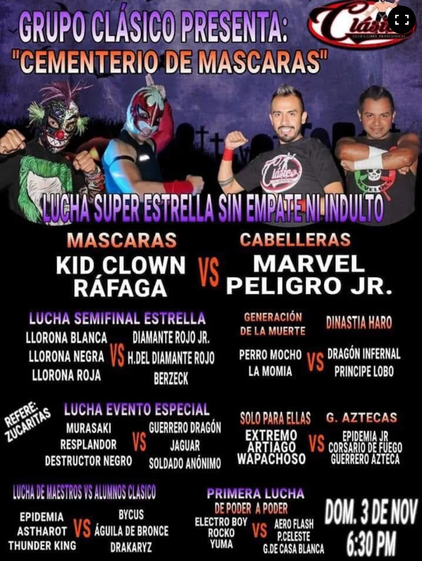 El luchador participó en la segunda lucha e hizo equipo con Epidemia Jr y Guerrero Azteca para enfrentarse a Extremo, Artiago y Wapachoso, donde la lucha estelar era una batalla de máscaras contra cabelleras entre Kid Clown y Ráfaga ante Marvel y Peligro Jr.