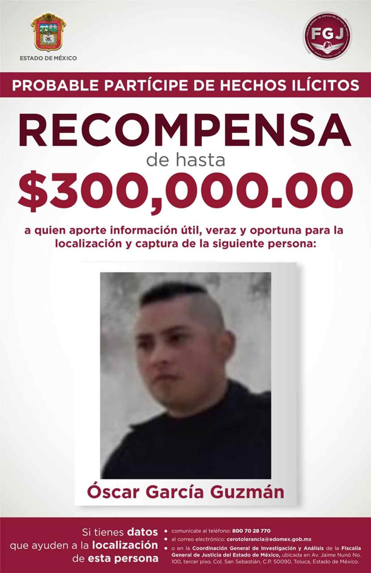 Ciudad de México. 5 de noviembre (SinEmbargo).- La Fiscalía General de Justicia del Estado de México (FGJEM) da una recompensa de hasta 300 mil pesos a quien de información que permita dar con el paradero de Oscar García Guzmán, presunto responsable del feminicidio de una joven dentro de un domicilio en Toluca, Estado de México.