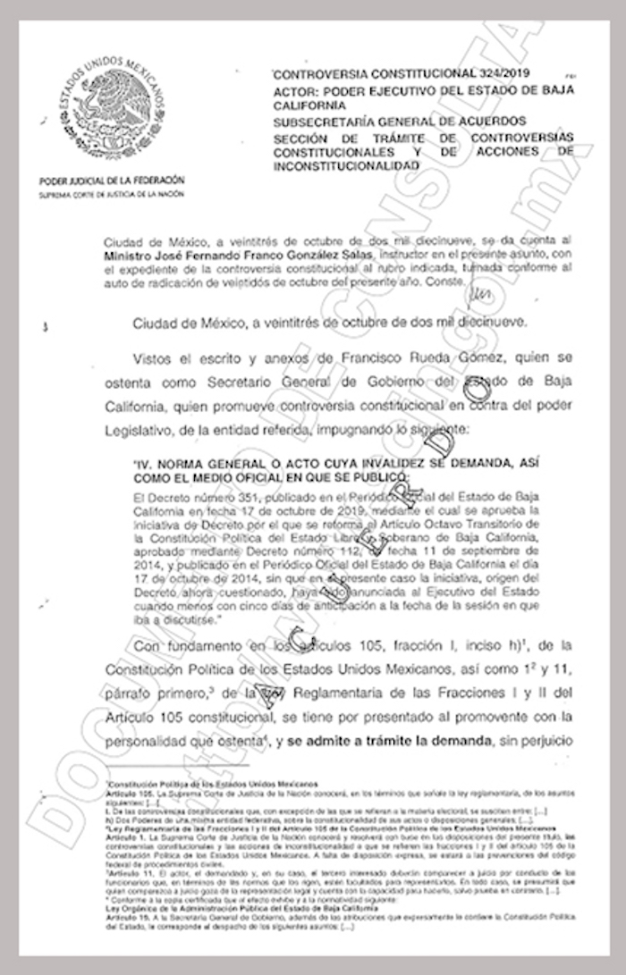 Por otro lado, la controversia procedente del Gobierno predecesor (el cual estuvo encabezado por Francisco Vega de Lamadrid) fue incorporada a una lista de acuerdos de la SCJN el 28 de octubre. En tanto que el recurso del Partido de Baja California quedó registrado un día después en una Lista Extraordinaria de Notificaciones del máximo órgano jurisdiccional.