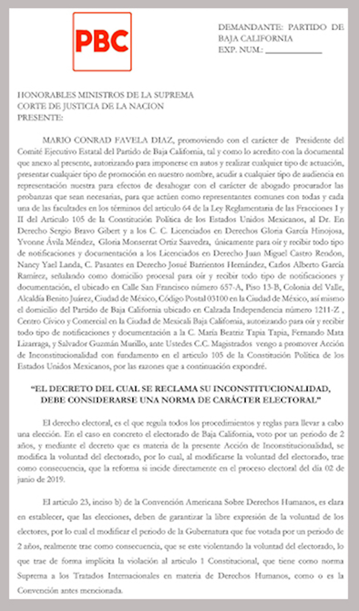 A propósito, el dirigente partidista Mario Favela Díaz mencionó que se trataba de “una vía que los abogados del partido no quisieron dejar pasar”, impulsada a sabiendas que de cualquier manera el PBC procuraría interponer una acción de inconstitucionalidad.